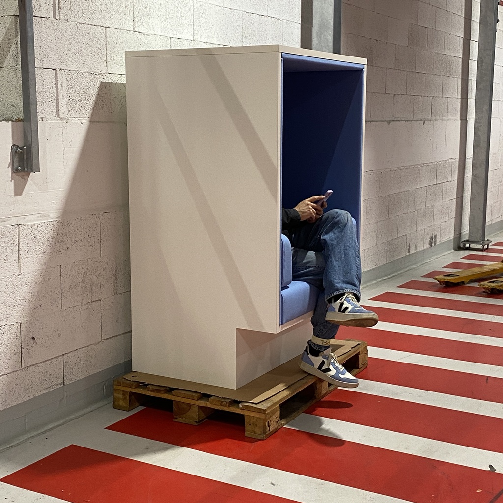 Structure en aggloméré laqué blanc. MUTE ARMCHAIR est une solution parfaite pour créer un espace calme dans un lieu qui ne l’est pas.