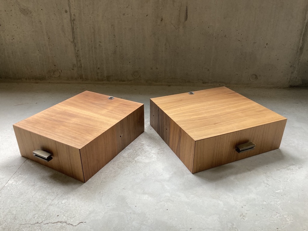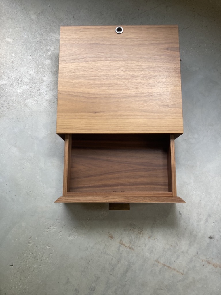 Table de chevet murale. Un tiroir complet avec glissière amortie, finition noyer.