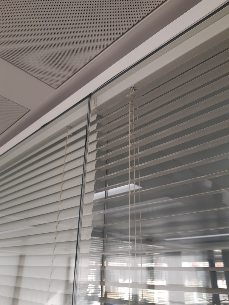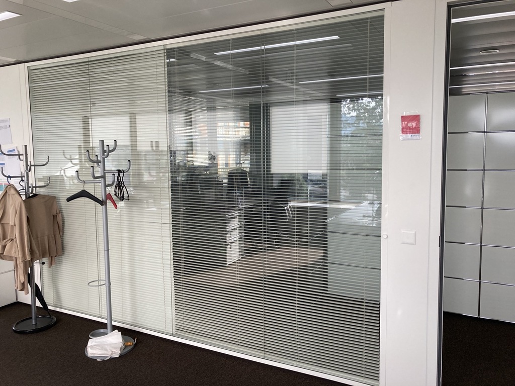 Cloisons Clestra PleinAir – vitrées avec stores manuels, RAL 9010. 96 ml vitrée. 204 ml y.c. portes et parties pleines